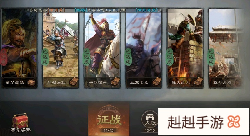 旗开得胜:单支部队通过一次部队指令(行军、驻守等)获得3000战功10次。