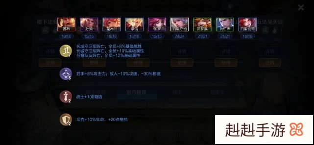 由于“长城军”羁绊关系是3-5-7名长城军英雄在场上时可以触发效果,每一名长城军阵营英雄阵亡都会给队友增加属性,所以我们在玩这个套路时并不需要给长城军英雄升级,他们在前排就是“炮灰”,快速阵亡后给我们后排的两个主打英雄增加属性就可以了。