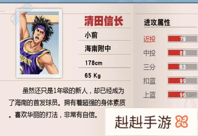 清田信长的隔扣非常强势,但是因为这个得分方式过于单一,很多玩家可能灌篮灌到吐了,队友也是毫无游戏体验,全程看无脑灌篮。而且猴子的这个灌篮也不是说100%就成功,也不是100%不会被封盖。所以后续也有很多玩家选择了中投来玩,但灌篮依旧很香。此外要注意一点,清田信长自身的中投属性其实并不高,因此想玩中投,在这方面的属性要特别注意堆叠。