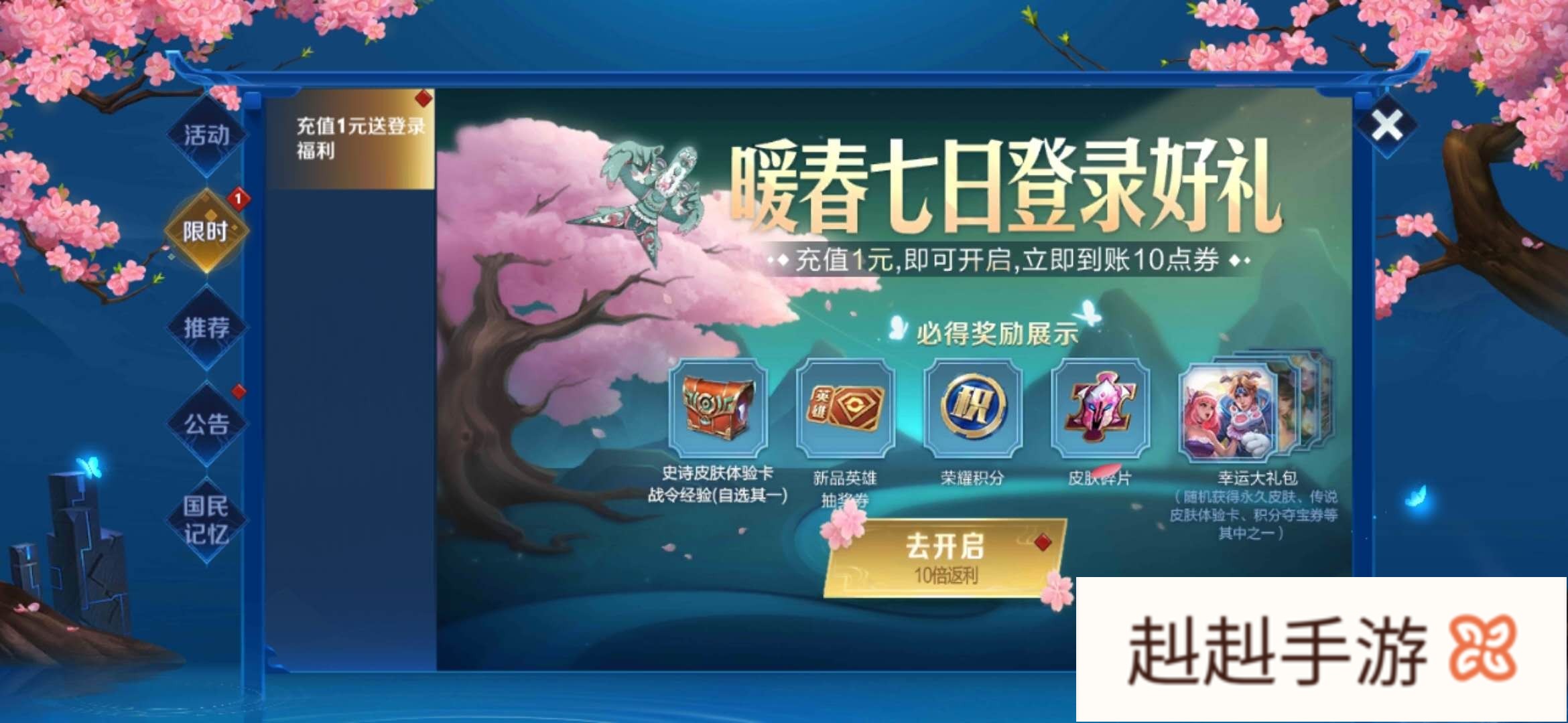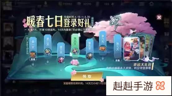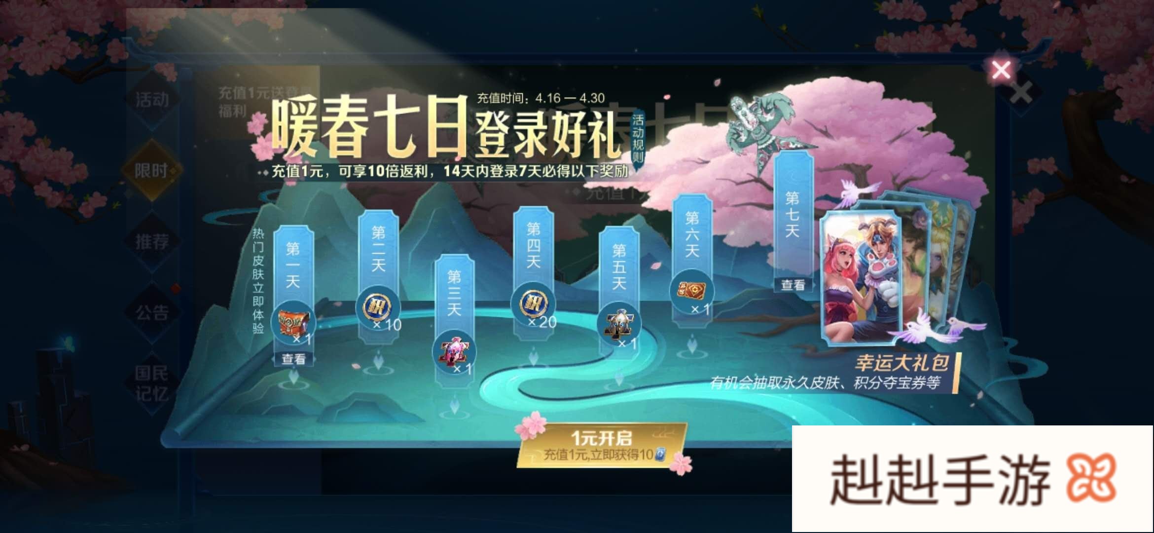 "暖春七日登陆好礼"这个活动,充值1元后,在14天内登录7天,就可以领取价值10倍以上的登录好礼,还有机会获得永久的皮肤。活动时间是4月16日到4月30日。