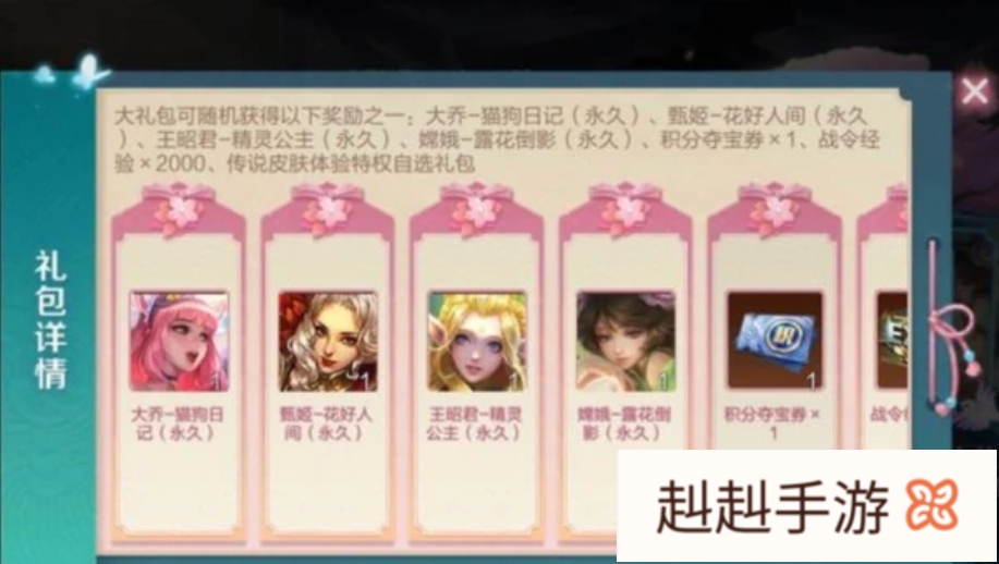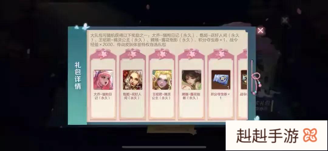 在第一天领取的暖春自选礼包里主要还是一些史诗皮肤体验卡3天的,或者2000的战令经验。主要的还是第七天所领取的暖春幸运大礼包,里面就有猫狗日记的皮肤,这是个礼包是随机的,根据官方公告说有着1%的几率抽到皮肤,不知道你会不会成为这个幸运儿。
