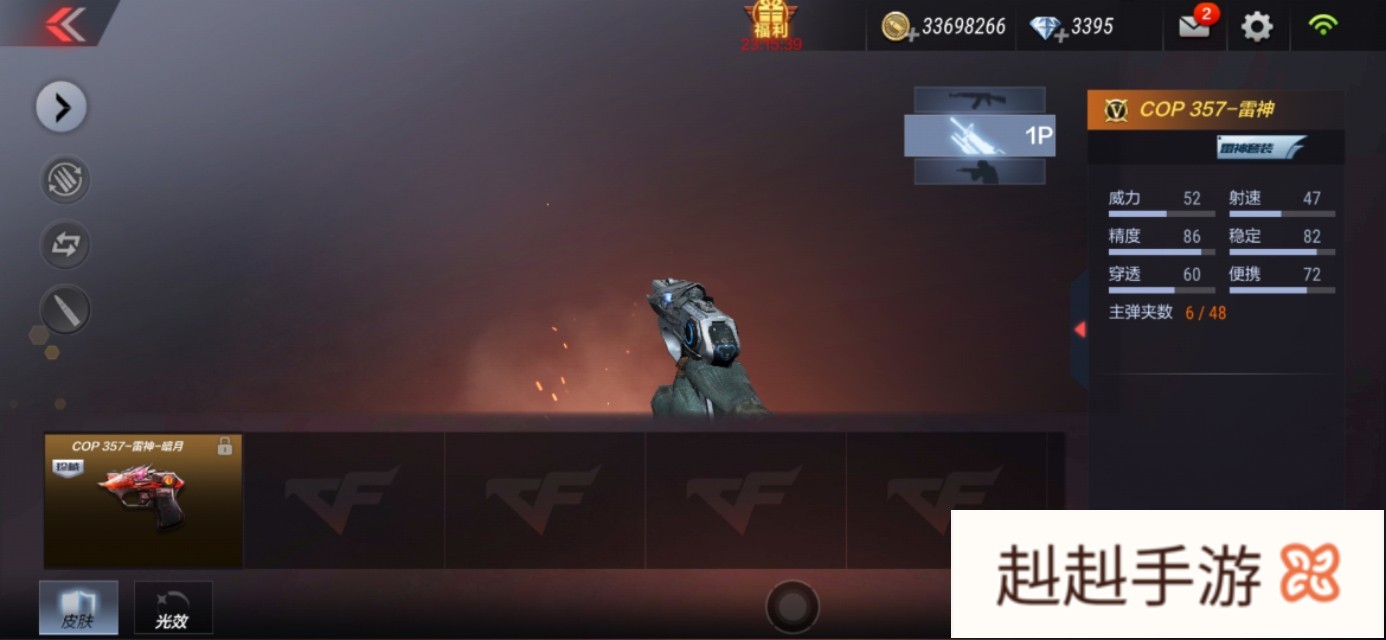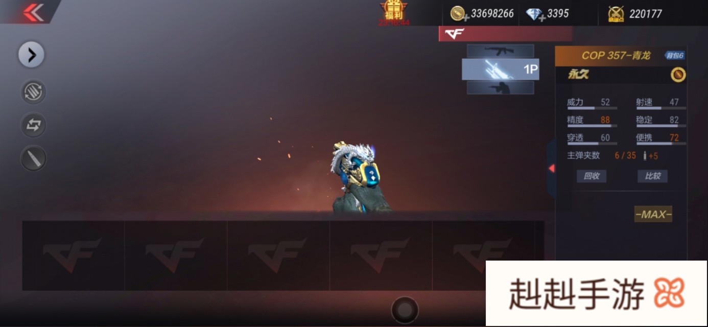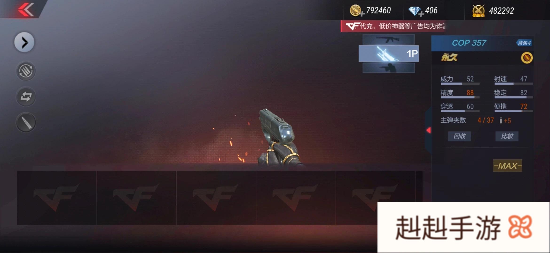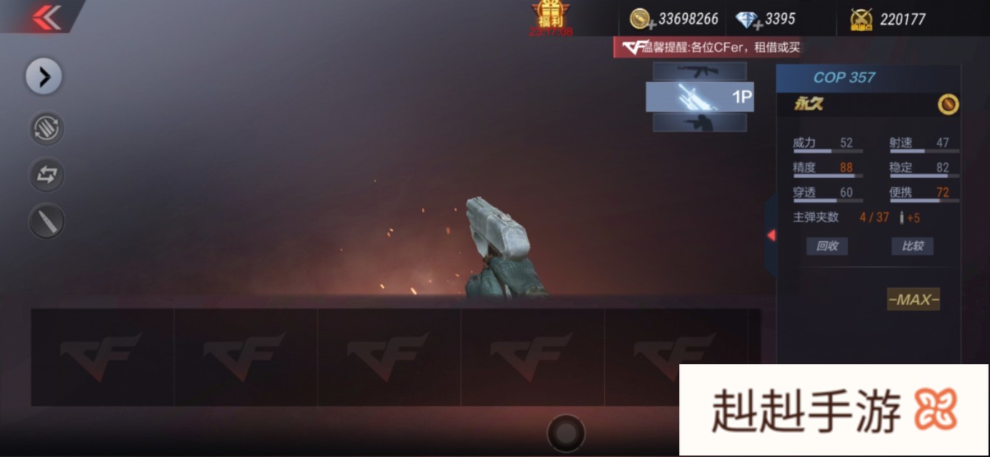 COP357的打法也十分彪悍,近身刚枪,利用自身的轻巧威力又大的特点,即使是AK也完全不虚。不过各位CFer要注意的是COP357的载弹很少,在有修罗和极光加成时才仅有6发(前置弹匣),所以这就要求我们尽可能快地解决战斗,而且在不必要的时候也不要浪费任何子弹,32发的备弹仅仅一会就会打光,尽量留子弹应对近身战才是明智的。