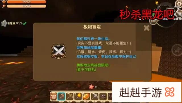 两样道具获得的方法想必大家都知道,便不做多讲解。拥有这些道具后,就去地图里展开挑战吧!一进入地图后便是来到了地心世界里的极限冒险模式,除外还会有提示“我们都只有一条生命(现实不是游戏,永远不能重生)世界却危险重重,发挥你的聪明才智,学会在危险中保护自己”!这句话也就表明我们只有一次的机会,一旦死亡,不可复活,需要小心。