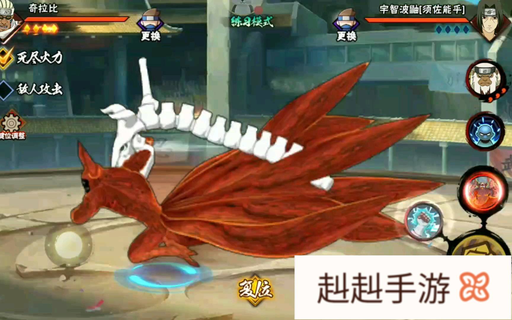 奇拉比有一个类似于卡卡西雷切的一个突进的起手技能,不过需要判断对方是否有抓取或者是相应的直线技能来阻挡你。然后还有一个尾兽化,尾兽化之后是一个霸体,在对方没有抓取或者是散或者是针对一些霸体的技能或秘卷的情况下,还是很好用的,可以随意的起手。大招如果在墙角的话是可以接尾兽化技能的。