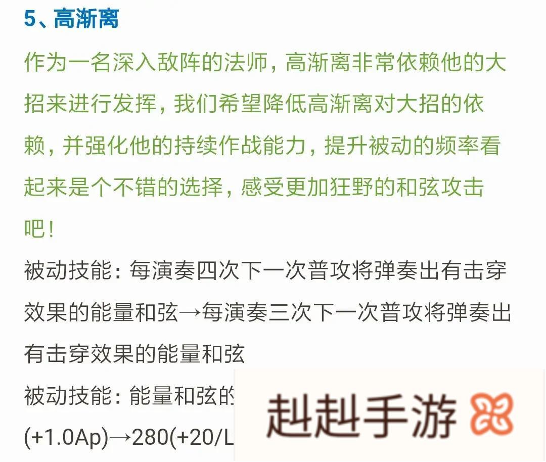 将原本四次演奏后的强化普通攻击提升为三次演奏即可强化普通攻击,即提高高渐离的被动使用频率。但同时降低的基础伤害与法术伤害加成,将减少高渐离的每次强化普攻伤害,本次调整降低高渐离的爆发属性,增加高渐离的持续输出能力,即在战场上越持久伤害越高!半肉高渐离升温,全输出高渐离或许强度会减少许多。