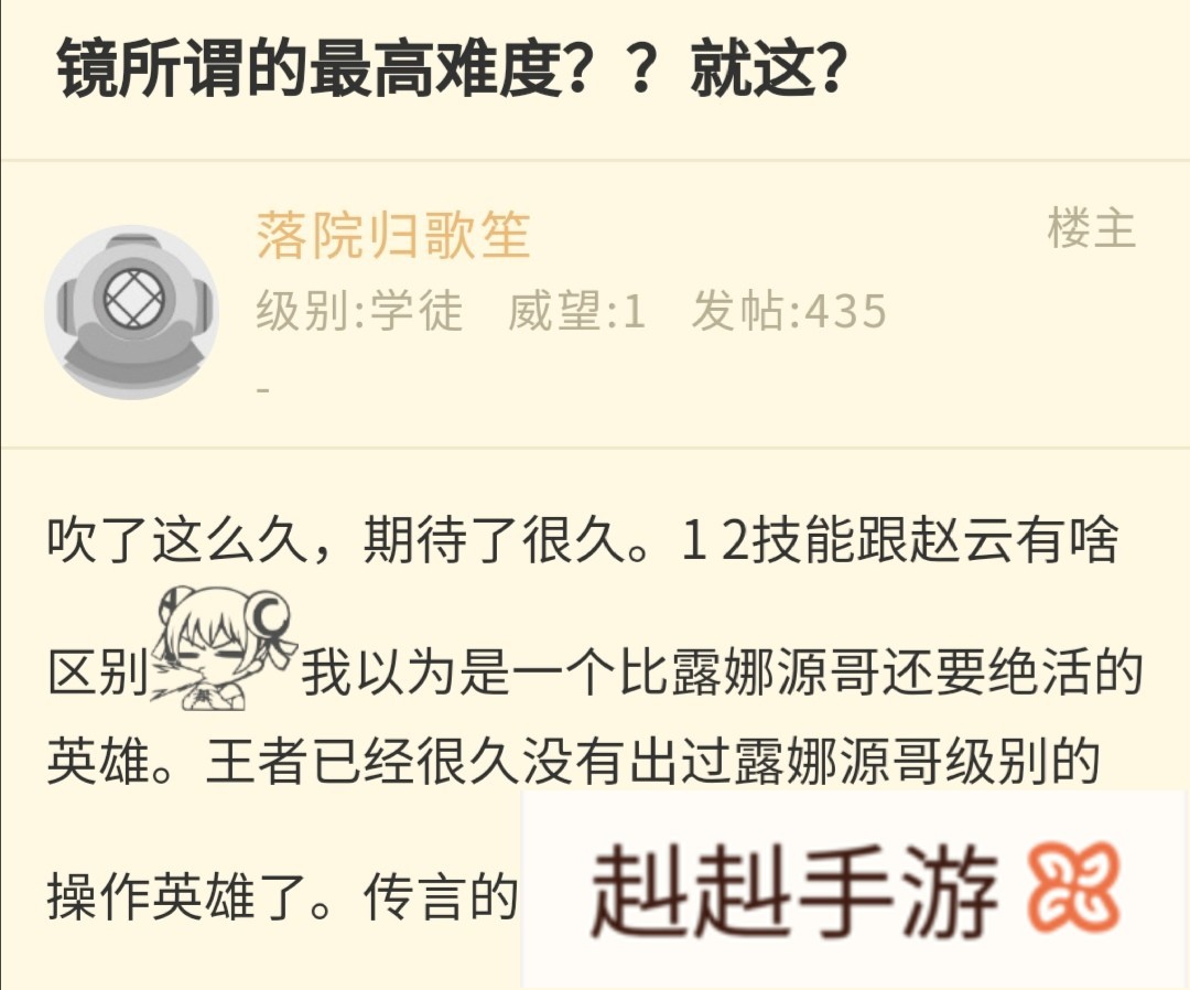 总结:传说镜比元歌还难从已知的爆料来看镜似乎没有难到想象中的程度。毕竟元歌刚出来的时候的操作是真的手跟脑子都跟不上。而镜的话除了大招需要大脑计算打出伤害以外一、二技能似乎没有很难的地方。至于会不会入手就要看玩家自己了,比较每个人的使用习惯都不一样。