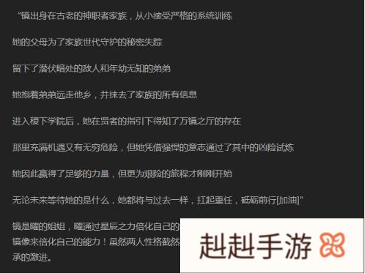 首先是她的背景解析,她是曜的姐姐,嬴政的情人。下面是官方公布的镜的背景故事。