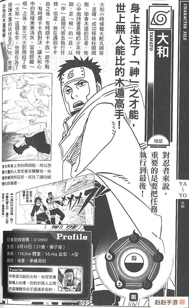 《火影忍者》动漫里面,大和是幼年时期,被大蛇丸往体内植入初代火影千手柱间细胞而继承了初代的木遁血继限界,会使用木遁忍术的忍者。大和直属于暗部,以前是团藏的手下,后来第在第四次忍界大战结束后,受命担任监视大蛇丸的工作。
