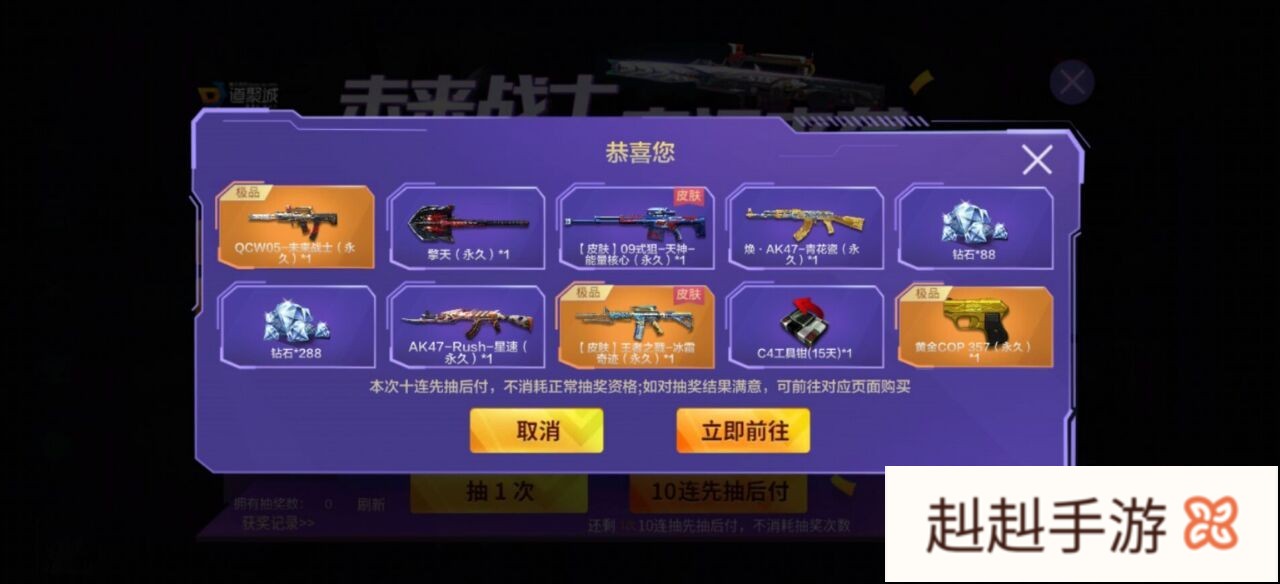 对于cf手游“先抽后付”的活动模式感觉还是不错的,玩家可以通过一些简单的任务来获取3次10连抽的机会。很多玩家也是通过这3次10连抽机会抽出了永久道具,当然抽出来的道具暂时还不属于自己的需要支付10连抽的价格才能获得。