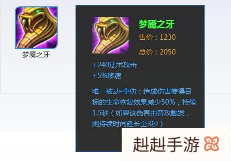 梦魇之牙是法术装备的一种,其可以增加240点法术强度和5%的移动速度。梦魇之牙的被动效果是对目标造成伤害同时降低其50%生命恢复效果,装备本身增加的属性就不错,而效果只限于克制特殊的英雄。