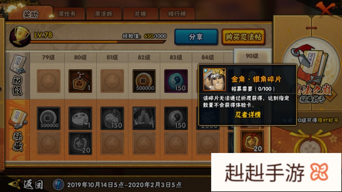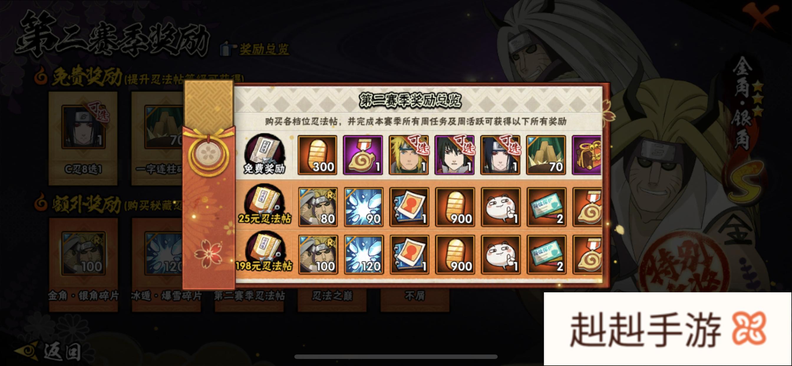 不过,第二季忍法帖现在已经过去了8周的时间,也就是说本周正常升级的玩家大概是在81级,198档位的是121级(不买等级的情况下),如果你之前正常升级的话,完全可以按照25+1980点券或者198档位来肝任务拿到金角银角,但如果你之前没有参与忍法帖玩法,现在又想参与的话,你就需要考虑一下差的这80级如何补齐,因为1980点券买50级只能买两次,后面就只能100点券买1级了。