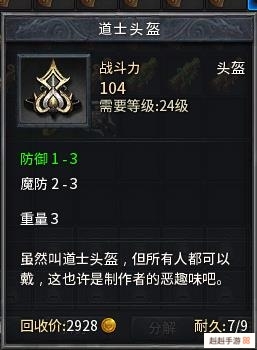 4、道士头盔这件装备很多人应该也是看到过吧,普通的道士头盔只有物防魔防,但有些极品头盔还能加魔法呢,3点的负重,3个属性很多法师玩家都会喜欢它的!