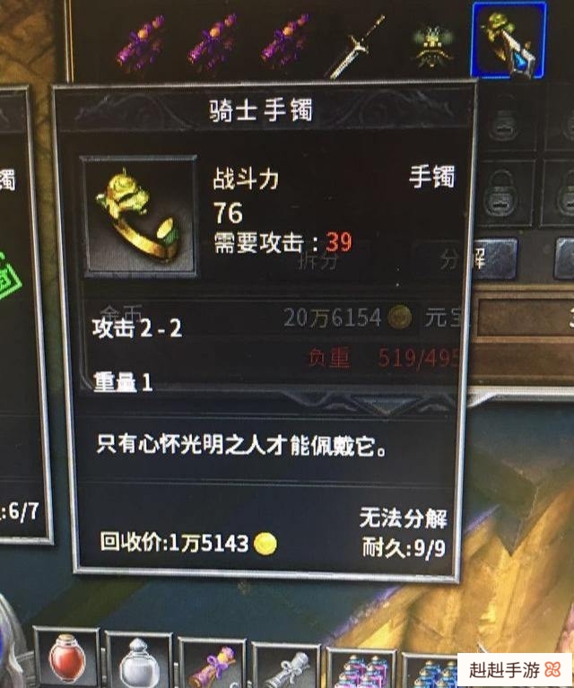 3、骑士手镯这件装备不是什么稀有物品,看起来和普通手镯一样,也只有2-3的攻击,但也是很多战士的毕业装备啦,它还有破防的属性呢。