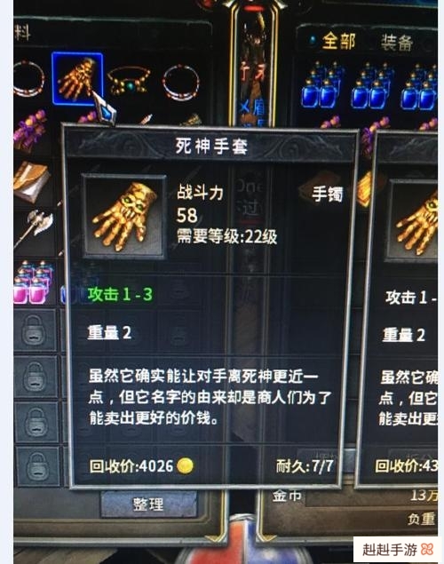5、死神手套玩战士的基本都用过它吧?攻击1-2,极品能到1-9,戴一双的话那就是2-16了,这种极品要卖的话能贵过普通的屠龙呢!
