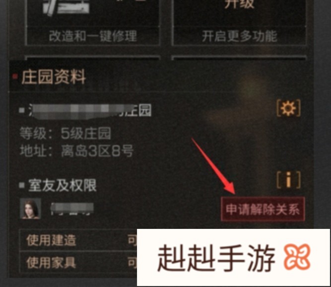 找到庄园控制器→资料→室友及权限→申请解除关系,取消后有2天的考虑期,希望有所帮助。