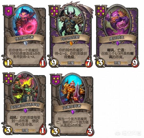 核心牌:“愤怒编织者”、“玛尔加尼斯”“灵魂杂耍者”“虚空领主”,配合大量的恶魔站场,恶魔体系后期也可以选贼加入“安尼赫兰战场军官”。“愤怒编织者”低费就可以拿到,特效提供的身材加持后期越来越强;“玛尔加尼斯”提供BUFF增益,升级后增益更强;“虚空领主”为必选恶魔;“灵魂杂耍者”提供额外伤害效果,升级后打6非常可观。