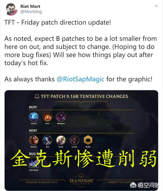 美服马上就要迎来9.16b版本,近日拳头人员发布推特,云顶之弈9.16b版本将要增强凤凰、纳尔、莫甘娜;而削弱的有德莱文、金克斯、天使、卢锡安以及贵族BUFF!因此,不少国服玩家看到这条消息后就开始抱怨:“还没有玩过金克斯呢,就这样被削弱了吗?”大部分人都在质疑为何国服的更新速度会如此之慢!