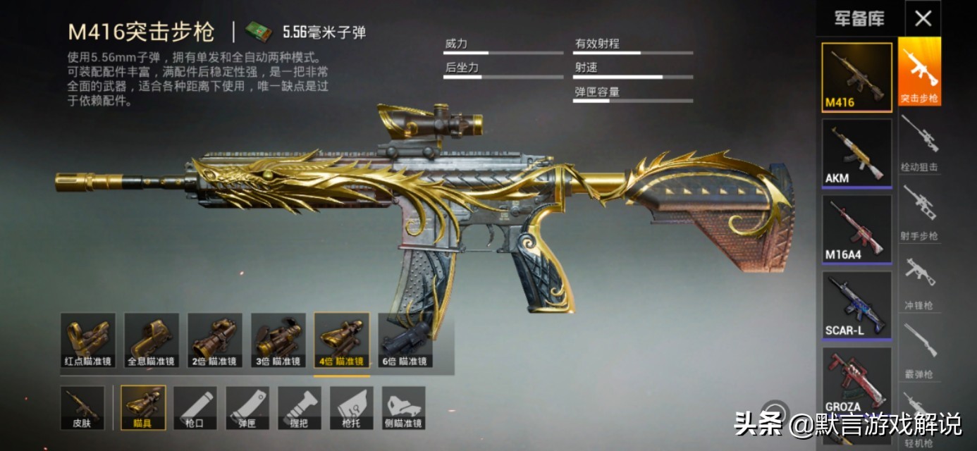 好看的皮肤,M416的射速,Ak的伤害,是这把枪如今使用率过高的主要原因。[当然不及狗杂]。