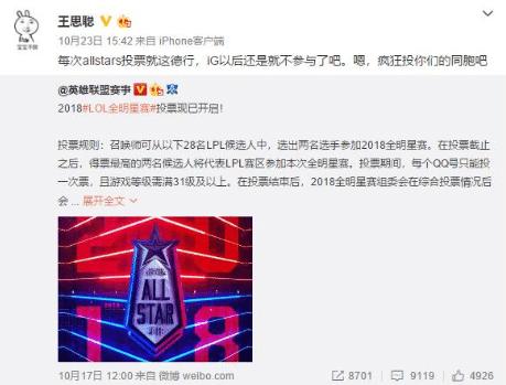 全明星赛往往通过票选的方式从赛区选择明星选手,但是去年由于投票时间在世界赛之前,最终导致IG战队作为世界冠军却没有选手通过投票进入全明星赛。最后今年改为世界赛之后再进行投票。