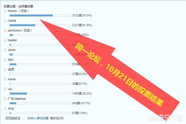 而同样在这个论坛,在10月21日又有网友发起了一轮S9全明星投票,这一次截至到10月31日,一共有5296人参与了投票,投票排名是:Theshy,Rookie,Uzi,厂长和Jackeylove。可以看得出来10月20日对于模拟投票的UZI来说,是一个至暗时刻。在囧王者看来,这一切都是和成绩挂钩的,因为熟悉英雄联盟的小伙伴们都知道,10月20日这个日子,对于RNG和UZI来说,确确实实是一个至暗时刻。