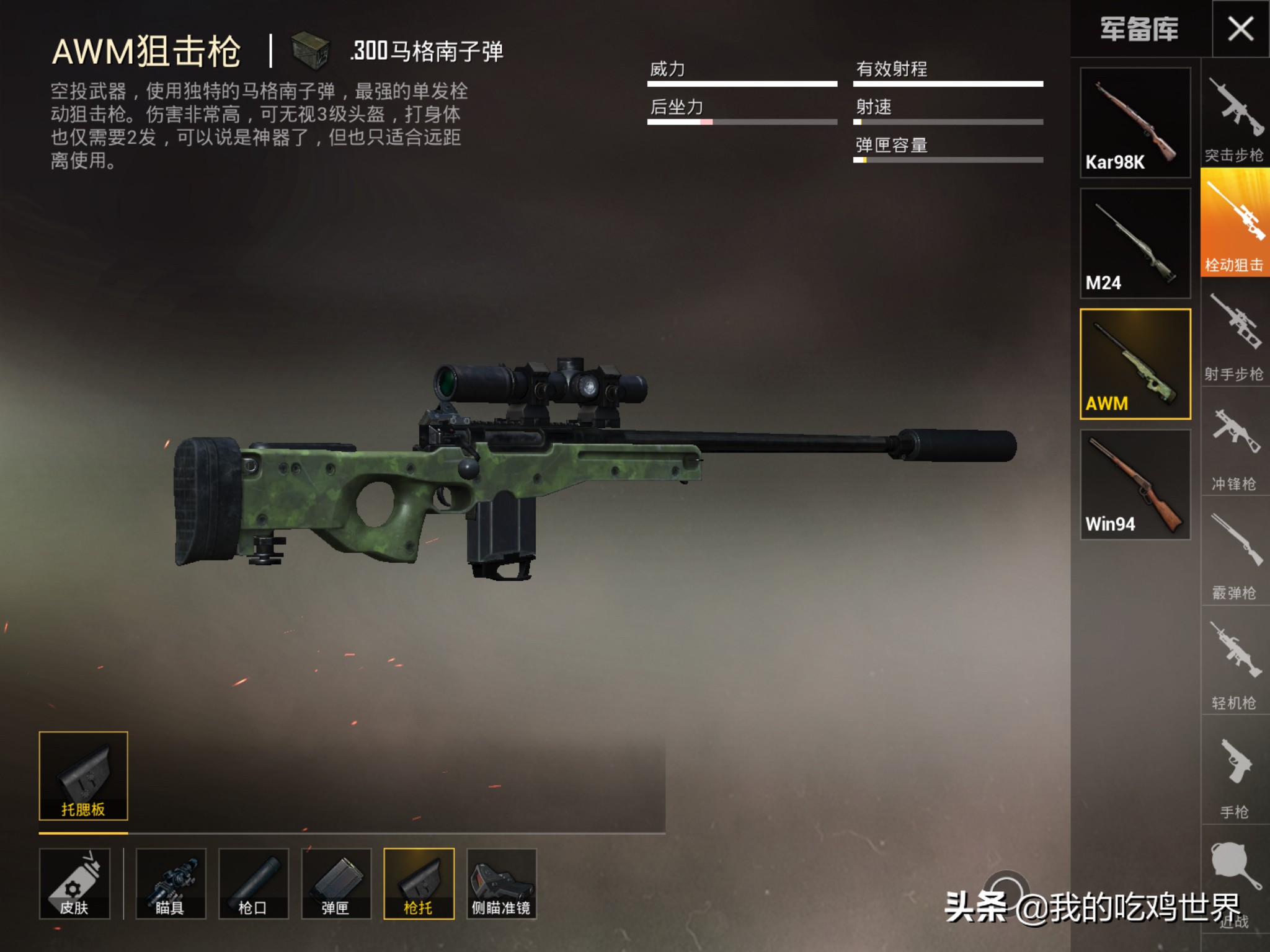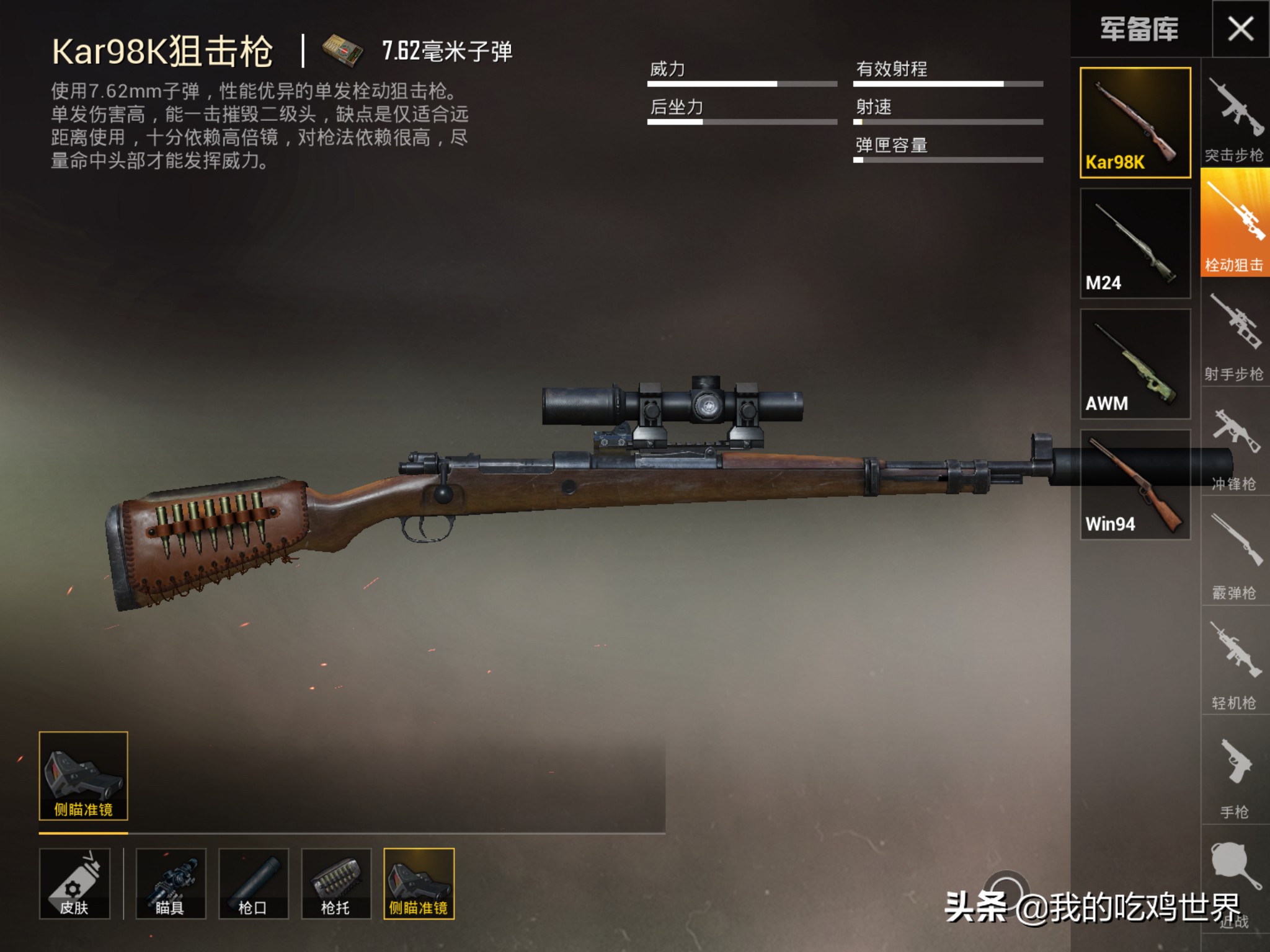 狙击步枪的枪械类型有:AWM、M24、Kar98k、win94。