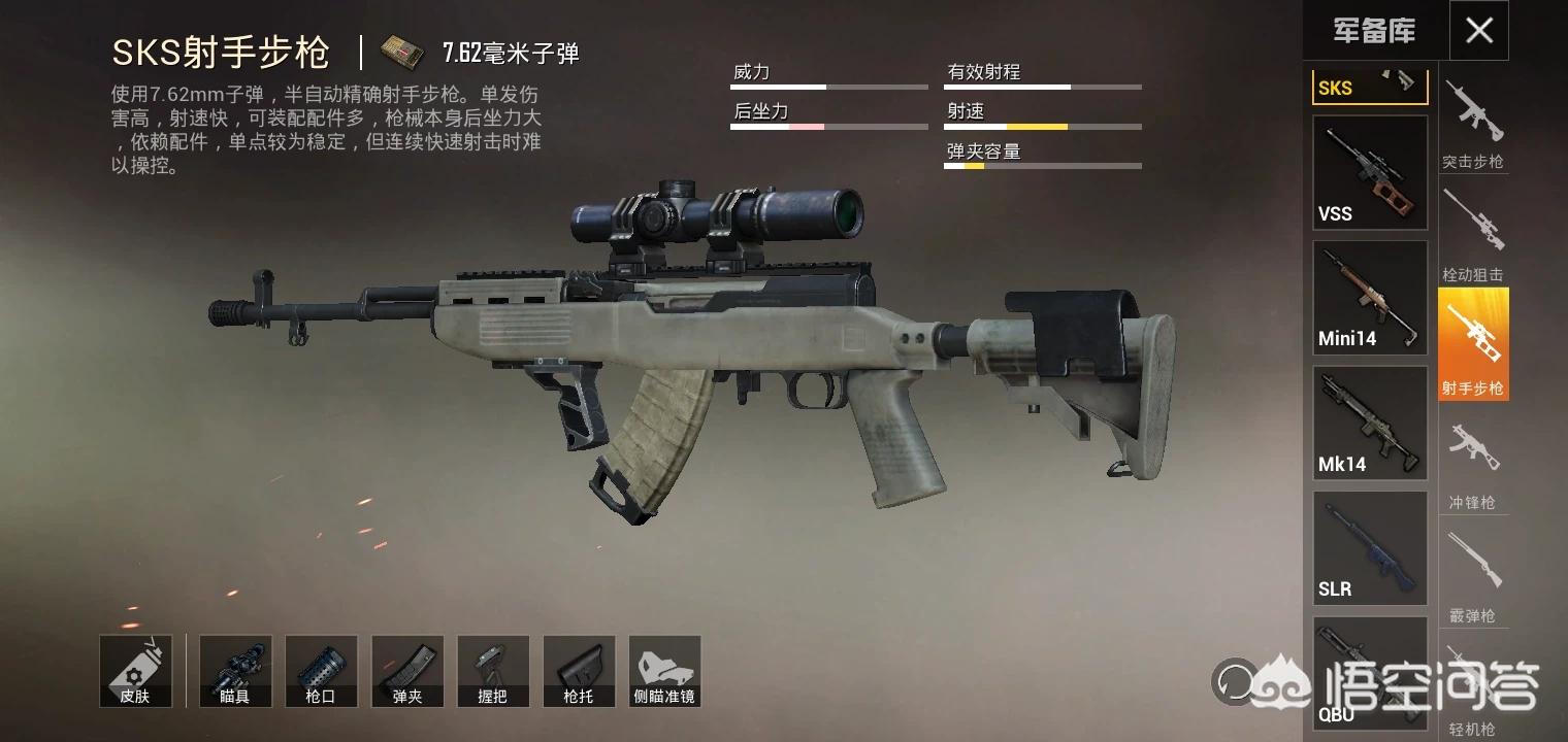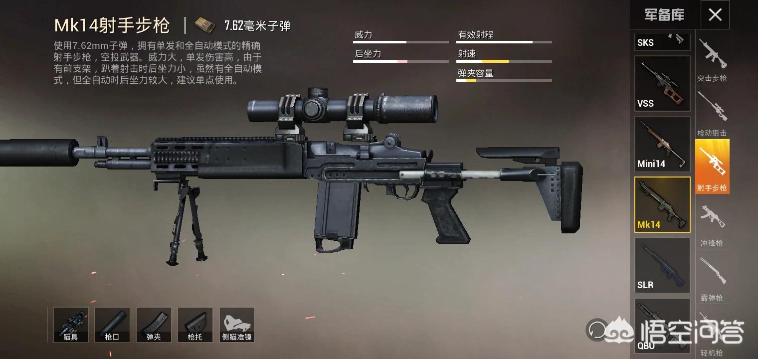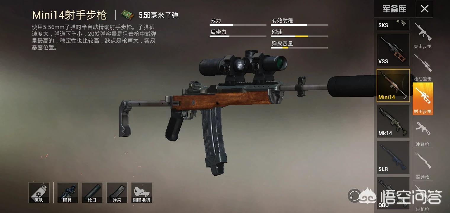 枪械类型:SKS、MINI14、VSS、SLR、MK14、QBU。