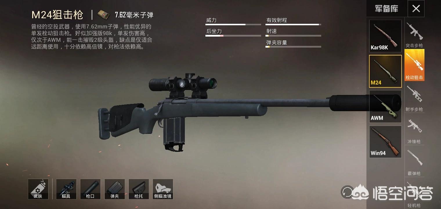 第二把M24这把枪吧,你就当作是98K的升级版,它伤害79……好像打头和98K一样,但是我们也要看打身体,它打三级甲少一枪以外,没什么不一样的。确定吗就是技术要求过高,还有声音比较大。但是值得一提的就是它装消音的时候的声音,真带劲。