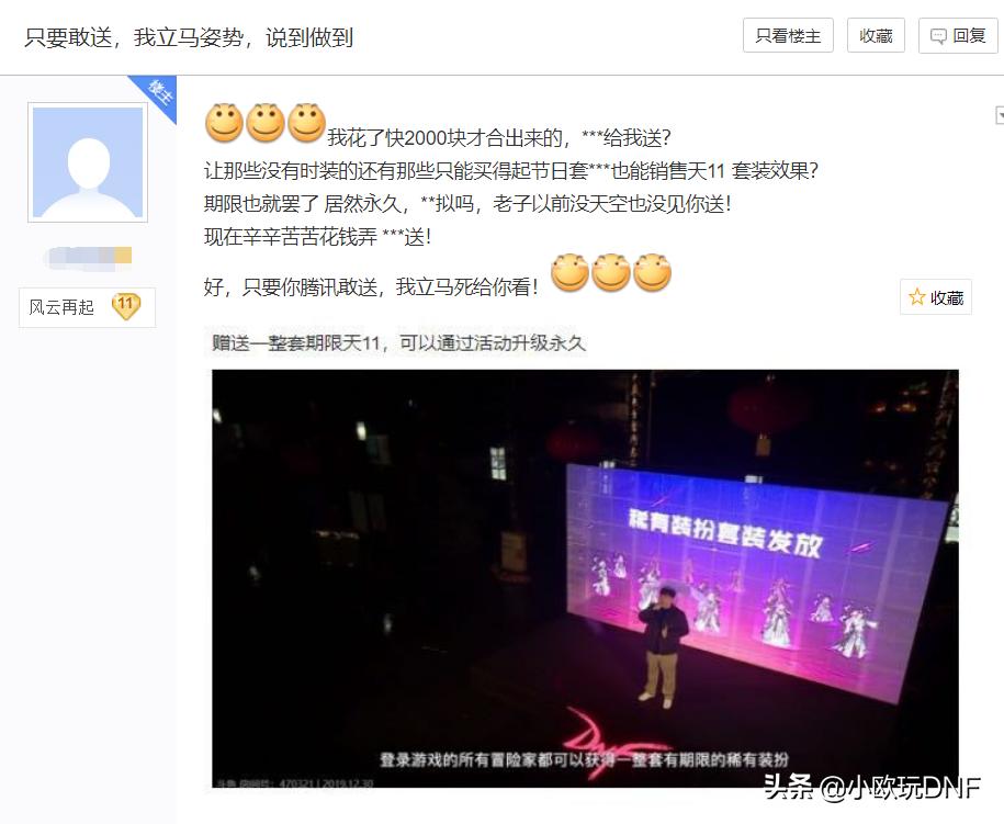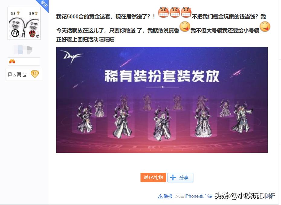 一,DNF玩家直言只要敢送天11套就"立马自杀",只因自己花了2000块才合出天11,你如何看?