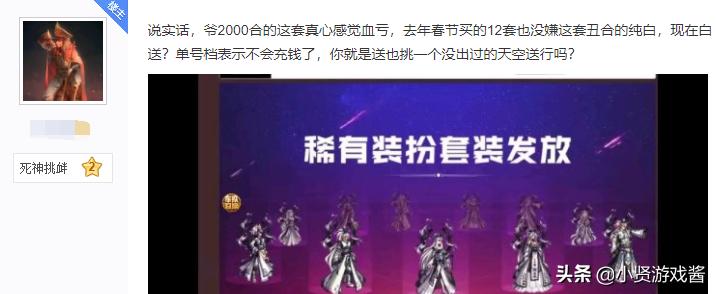 对于天11天空套白送,玩家会发现这些想法我们从中可以感受到玩家心里极大的不平衡,换位思考如果自己花了这么多钱合的天空突然白送自己也会不爽,不过在拥有一套之后再把白送的给小号何乐而不为呢,不要白不要,免费的天空套它不香吗?
