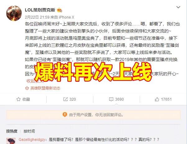 而如今由于“机甲战神”皮肤闹得沸沸扬扬,因此策划决定重新上线“鸡里奥”活动来获取玩家的信任!策划透露,新版本“鸡里奥”活动将会在2月底上线国服,虽然专题和细节还在准备中,但是可以确定的是,玩家最少可以从鸡里奥活动中获取4款皮肤,其中有3款即将上线国服的腥红之月皮肤,还有一款是剑魔的至臻皮肤,除此以外玩家可以通过活动获取2020至臻点和一些其他奖励!