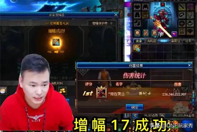 就在近日,旭旭宝宝和狂人两大DNF主播都在直播时增幅17装备成功,一个是国服第一红眼,一个是国服第一剑魂,两个主播都是DNF中的神豪玩家,一年在游戏中的投入都是上千万。