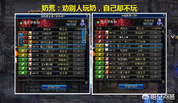 DNF奶荒,随着100级版本的临近,愈来愈严重,经常出现漩涡6=2,普雷9=3的尴尬局面,大奶基本绝迹,混子小奶团长又看不上,于是出现了如图所示的一幕:奶荒严重!