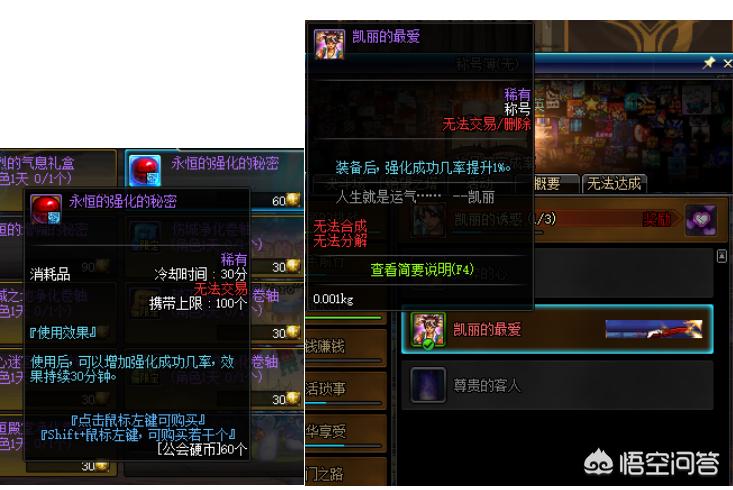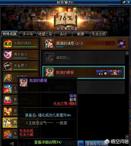 【凯丽的最爱】:这是个任务称号,只需要强化成功30个+10以上的装备即可获得,可以提高1%的强化成功率。