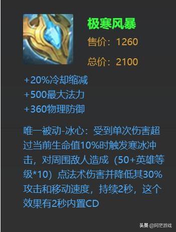 第一件也是夏侯惇这种玩法的核心装备极寒风暴,这个装备可以提供20%的冷缩可以在前提取得非常好的优势,500生命值,增加坦度,360物理防御增强容错率,最重要的是可以对周围敌人造成减速,团战也是留人的需要。而且这件装备不算贵,而且小件对于他也有用,这件装备是他度过前期的资本。