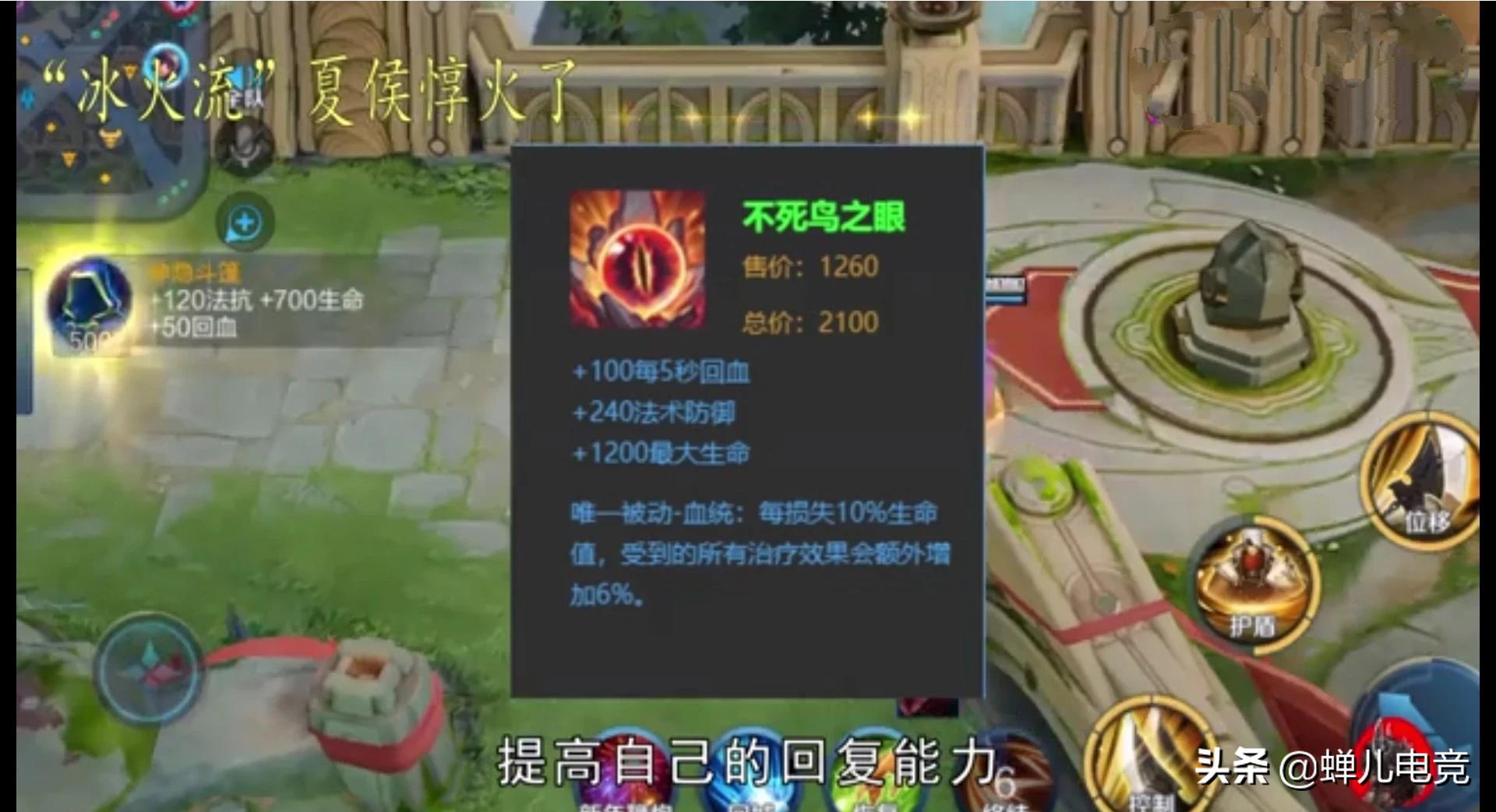 然后在选择出一个不死鸟之眼,我们知道不死鸟之眼这件装备可以给夏侯增加100每5秒回血,240法术防御和1200最大生命,每损失10%生命值受到的所有治疗效果都会额外增加6%。这件装备可以大大提高夏侯的回复能力,切入战场后敌方的ad很难秒掉你。特别是开启二技能之后真的可以说是站撸无敌!这三件装备出完之后可以选择出一个攻击装备暗影战斧,最后一件装备可以选择出复活甲。