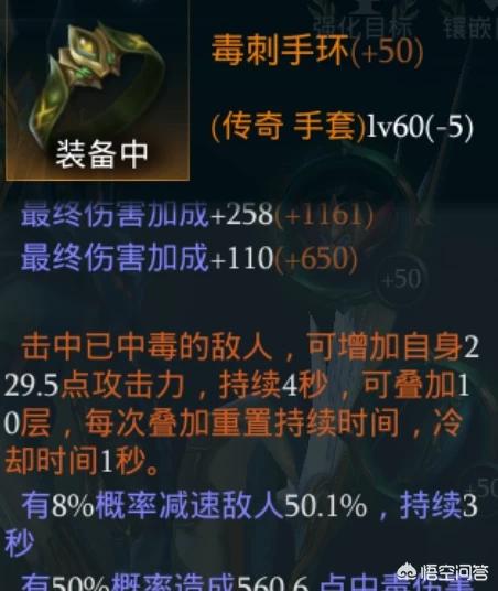 手部:毒刺手环,效果是攻击中毒的敌人增加自身的攻击力,由于迷影套效果会使我们的所有攻击都会附带中毒效果,所以这个装备是不二之选,这个装备比较难出,所以公测后小伙伴们有出了别手快分解了,最好每天去拍卖好看看有没有不懂的玩家在低价卖,你们懂得。