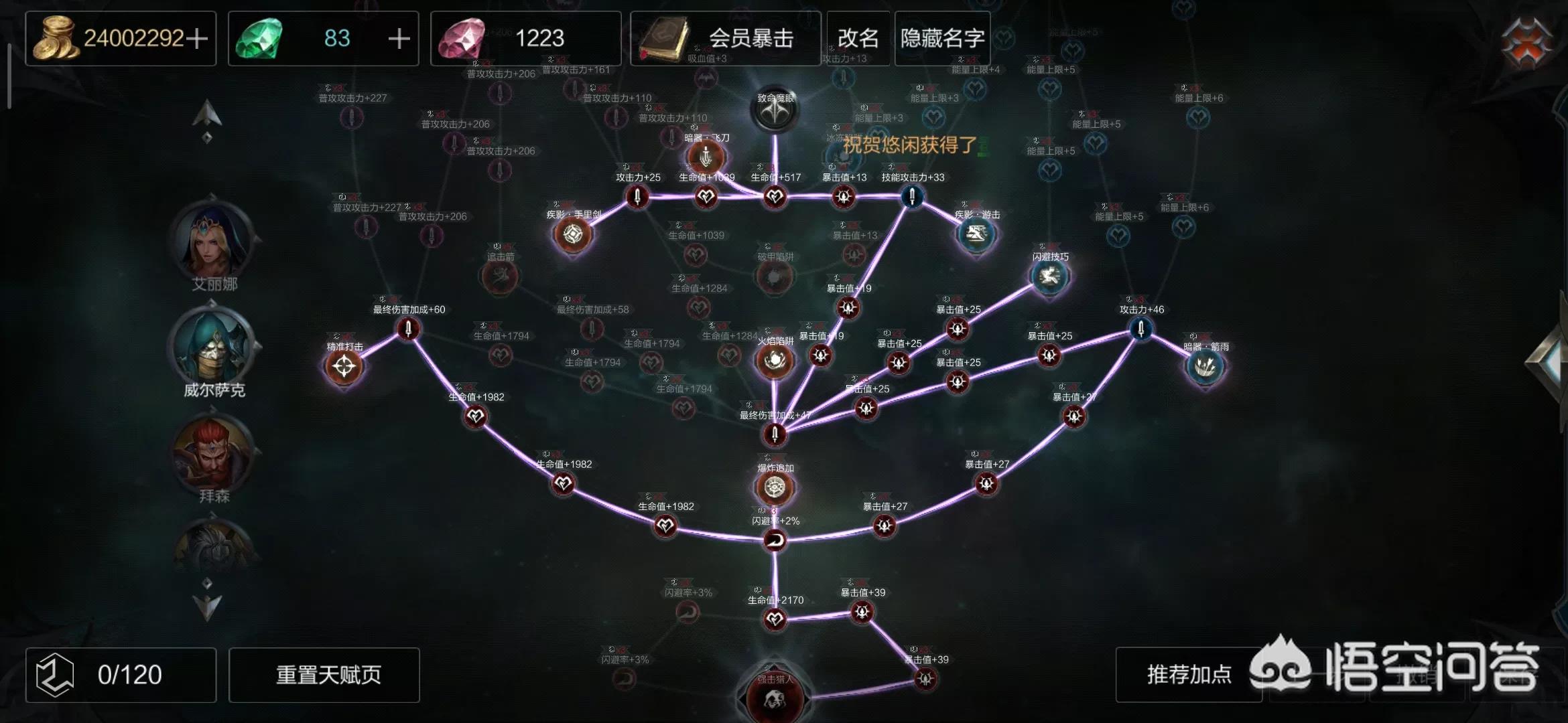 天赋推荐:暴击流如下图,不一定就说一定要我这样点,这样点可以将输出最大化,暴击几率高,可以多段位移跑图快,触发技能效果更高。小伙伴们也可以自己尝试着点。