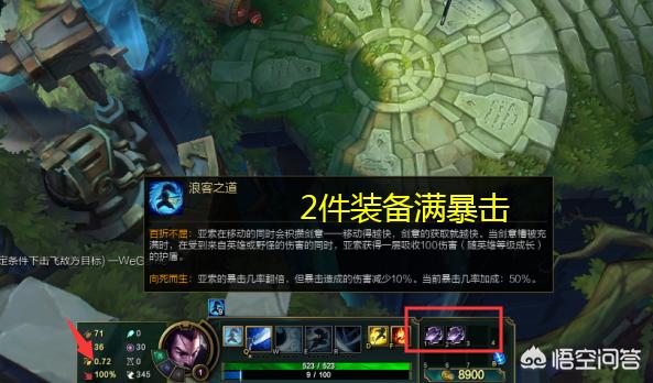 其次在新版本中,有的玩家研究出来了双风流亚索,所谓的双风也就是出两个灵巧披风了,大家都知道亚索的被动很厉害,并且有两个功能,其一是护盾,可抵挡敌方英雄的伤害,其二就是暴击几率翻倍,如果两件灵巧披风在手的话,暴击几率就可到达100%,也就是说刀刀暴击,关键是披风的价格并不贵,800块一件,也就是说亚索在10分钟就能到达100%。