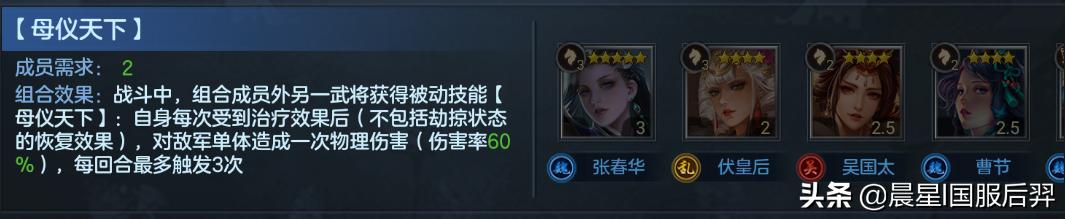因为荀彧能够让前锋在受到伤害的时候恢复兵力,所以就可以搭配“母仪天下”的武将组合。因为这个武将组合的组合技能可以在恢复兵力的时候造成伤害,能够和荀彧有个不错的契合,所以张春华搭配荀彧,再加上曹节的“辅助流输出”被发明的出来。