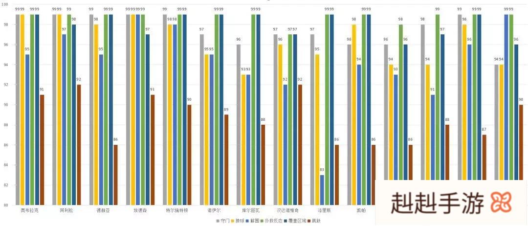 由于门柱君心血来潮,为了更加方便大家进行对比,我们将14名门将的数据做成了柱状对比图,从中可以明显地看出哪个门将达到99的数据最多,也可以看出谁的守门数据最为均衡。显而易见的是,下赛季的第一门将之争大概率是在奥布拉克、阿利松、埃德森、特尔施特根以及唐纳鲁马五人中进行,德赫亚、诺伊尔已经逐渐失去了竞争力。