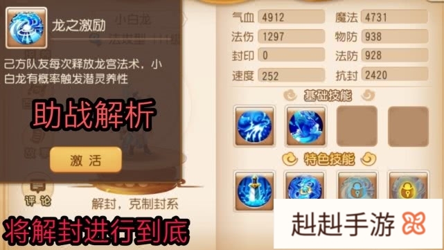而且天脉培养后小白龙的技能“龙之激励”使得他成为了龙宫队伍中的一名战术提升大师,队伍中每有一个其他龙族伙伴,都会增加一定的解封概率。就算小白龙被封印也不怕,关键是他就算被封,潜灵养性也可以使用。