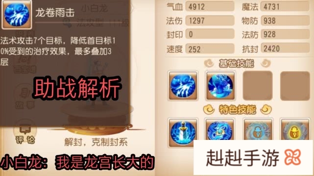 不过毕竟是有背景的孩子,小白龙这货法系实力可能不咋滴,但是小白龙在对局中对形势的把握还是十分精准的,在对面场上人数较多时使用龙卷雨击,降低对方的受治疗效果,如果对方单位较少时,就果断使用龙腾,同时技能双龙戏珠也不是抓瞎,使用概率极高,尤其是战场只剩2个或者3个人的时候,他对战场时机的把握堪称所有助战中最懂的。