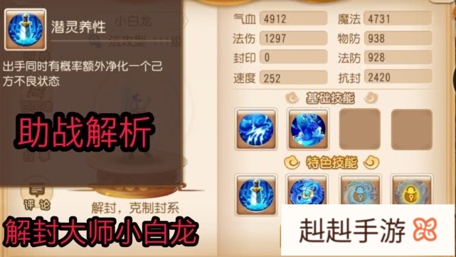二、解封大师。前边讲到小白龙是解封大师你可能很奇怪,但是看到他的技能潜灵养性你就会明白了,这个技能可以一次性净化掉一个己方单位的全部不良状态,这里划重点(所有不良状态),请注意你没有看错就是所有,更要命的是这个技能并不占用出手次数,也就是说每回合他可以出手两次。