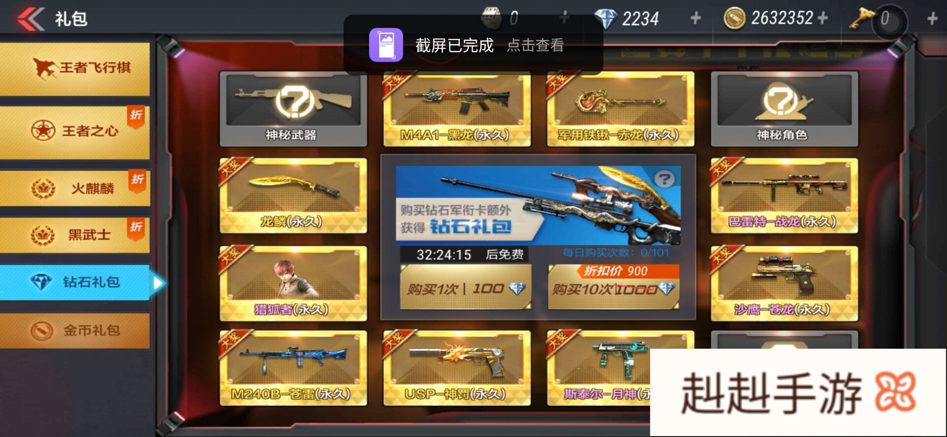 2.钻石礼包 现在的钻石礼包全永久中有黑龙的,爆率有点高,如果你觉得有点点欧气的话可以去试试,便宜的话100钻就拿到手