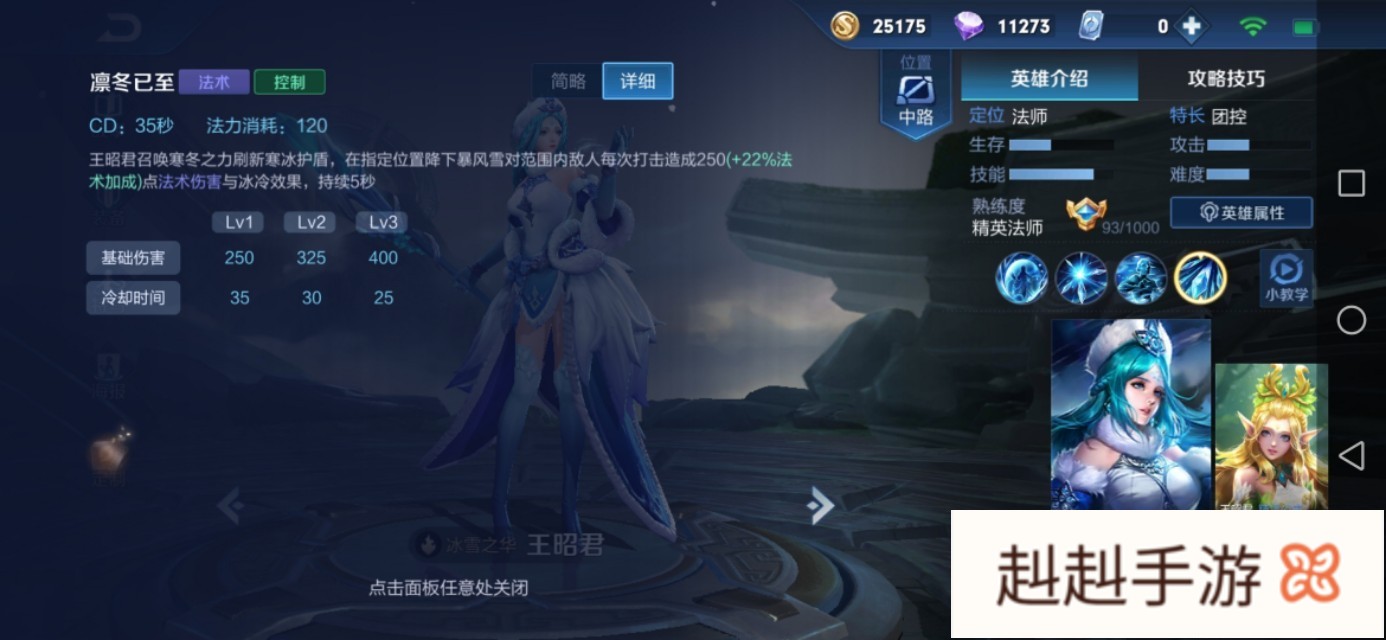3、王昭君大招:王昭君召唤寒冬之力刷新寒冰护盾,在指定位置降下暴风雪对范围内敌人造成法术伤害和冰冷效果,持续5秒;冰冷效果:减少目标50%移动速度与30%攻击速度持续1秒。