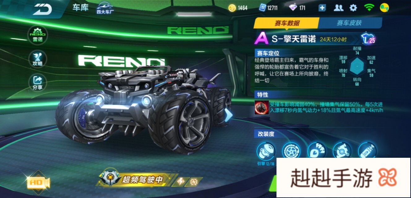 雷诺赛车数据为:耐撞74 漂移59 喷射70 转向68 集气59 加速62