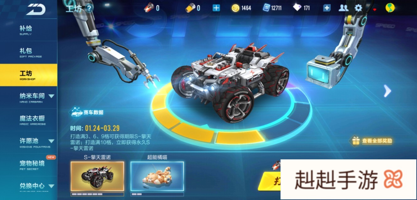擎天雷诺的获取方式是在游戏里找到寻宝系统,再找到工坊,使用橙色光源充能满十格获取永久。