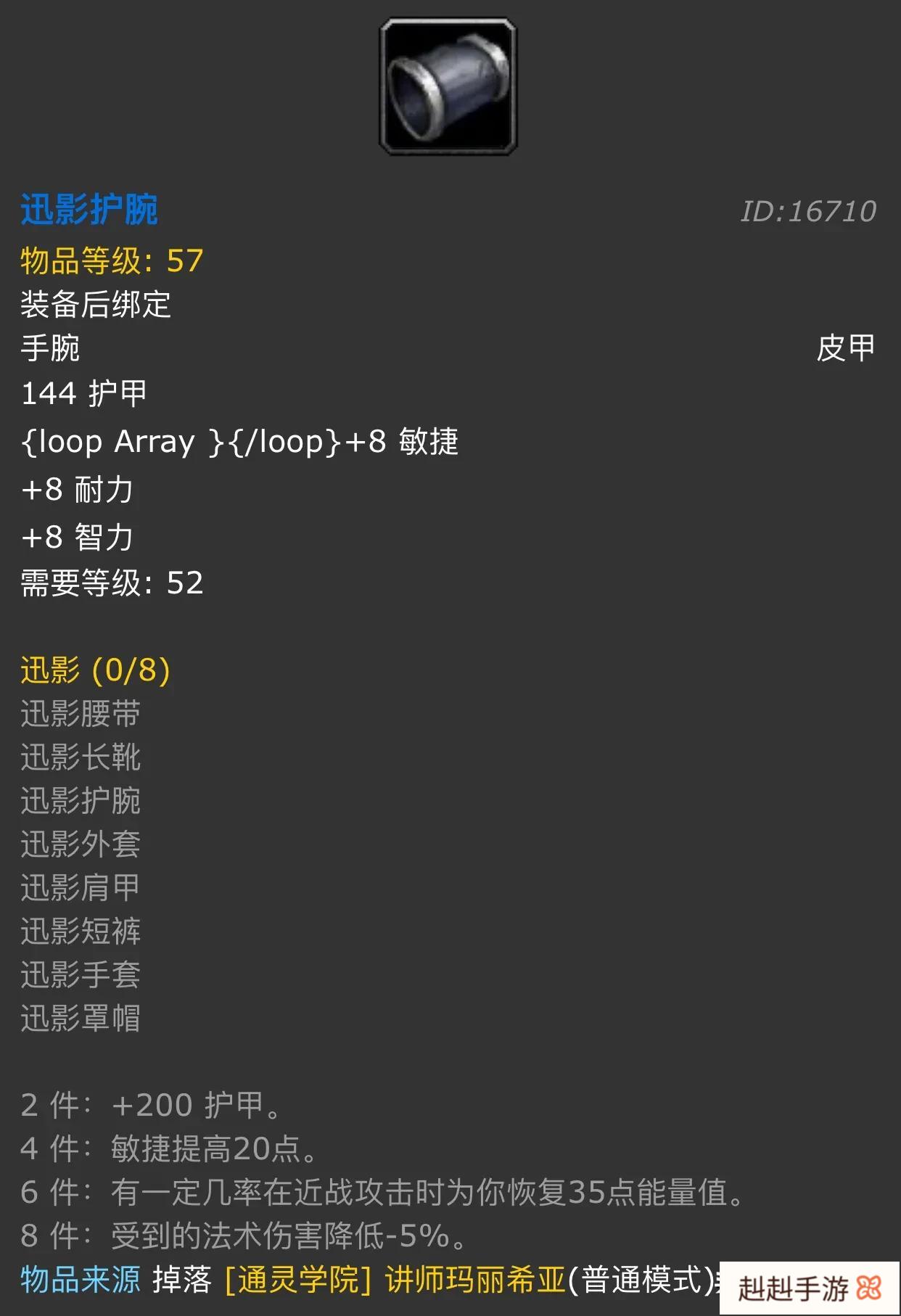 3)迅影护腕 +15敏捷,7耐力 装备后绑定,黑石塔小怪暗影猎手,通灵学院小怪复活的构造体,黑暗幽灵掉落,几率约为1%。成交价在110G左右。 4)迅影头盔 +20敏捷,18耐力,13力量,5精神 通灵 院长掉落,几率约为7%。