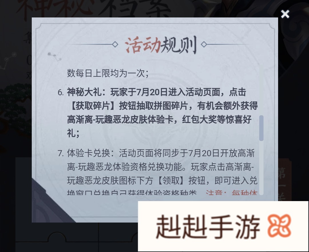 最后是高渐离--玩趣恶龙体验卡的获取方式了,这个大家可能都找不到入口,不知道怎么获取体验卡,进入兑换界面又不能兑换,都很郁闷,其实这个体验卡是在大家开启获取碎片的时候随机额外开出的,有很大一部分靠的是运气,运气好的可能都已经拿全了,但运气差的估计到现在一个体验卡都没有见到,小编也是那个运气差的人,到现在什么也没有开出来,只能继续等了。这个活动其实是天美在找人测试皮肤,然后发现bug优化bug,所以才发放抢先体验卡。后续官方上线了大家可以去购买,但具体什么时候上线还得等官方通知。