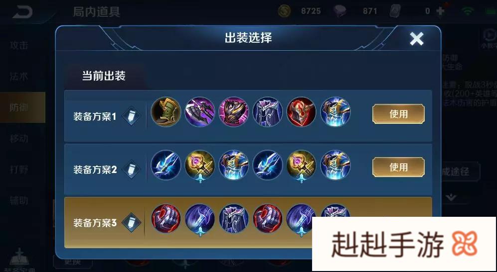 在学会秒换装备之前,玩家得先对自己的装备做一番设置,这里就拿花木兰来说。在三套装备方案中,第一套作为花木兰的常规出装,而第二套则是花木兰的保命出装。当然,玩家还能够再出一套保命方案,避免复活甲、辉月和名刀的次数用完。